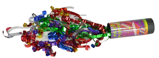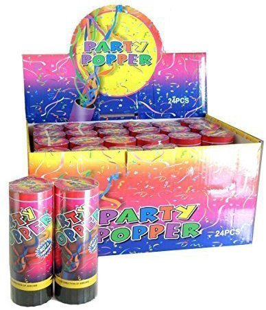 Party Popper 12 Inch 72ct This Confetti shooter uses compressed air to disperse color-assorted tissue confetti 5 to 8 meters (16 to 26 feet) into the air. (more)