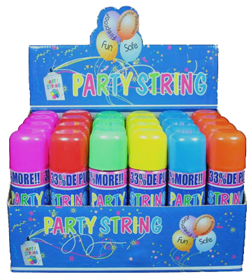 Instead of boring decorations ... spray some Silly Crazy party String Sold in a mastercase of 24. Silly Crazy Party string is a huge party favor and promotes silly times for kids and adults. Each case has four of each color: Red Blue Green Purple Pink YellowNon-flammable and CFC free. This item can only be shipped UPS ground. Sold in master cases of 72 cans. Each master case contains three display cases of 24 cans. Ask about large discounts when buying in bulk.